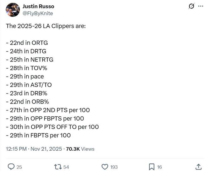 开季至今,快船队12项数据均排在联盟倒数,具体数据如下: